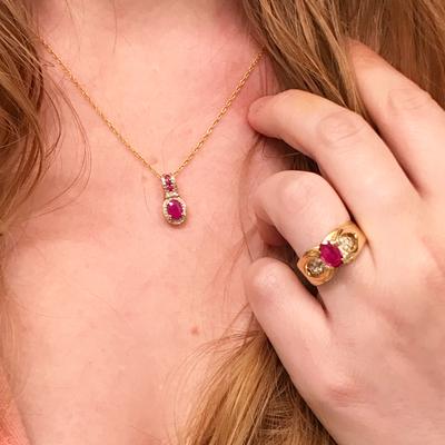 Gorgeous natural ruby accented with diamonds in a yellow gold (plated) setting it matches my heirloom one of a kind wedding ring, so naturally I had to buy it. I do wish it was solid gold.