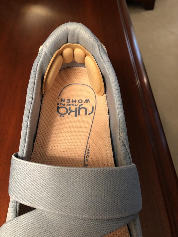 Ryka fits great in the back of the heel, except this one which is wider than normal, slipping when you walk. The strap is not adjustable so they flop around. Since they were a Mothers Day gift, l am stuck with them since 30 days past buy date. Disappointed.