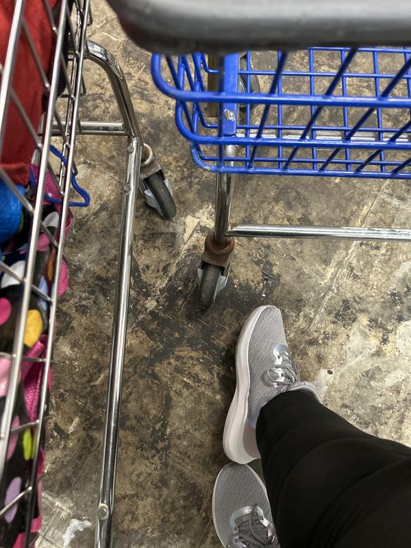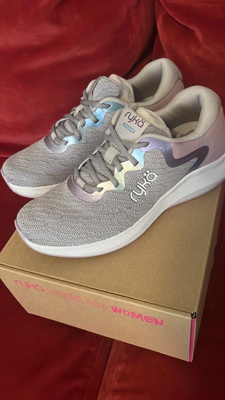 I ordered the 8W gray/ silver color after reading many reviews that really praised this color. So happy I did- it truly goes with everything, and the subtle pink/ light blue iridescent trim is a lovely compliment. I have a slightly wide foot at the toebox, and a previous order of Ryka regular width had to be returned. These are perfect with padded running socks or hiking socks, which allows a snug enough fit. As others have stated, I feel I could walk in them for hours.