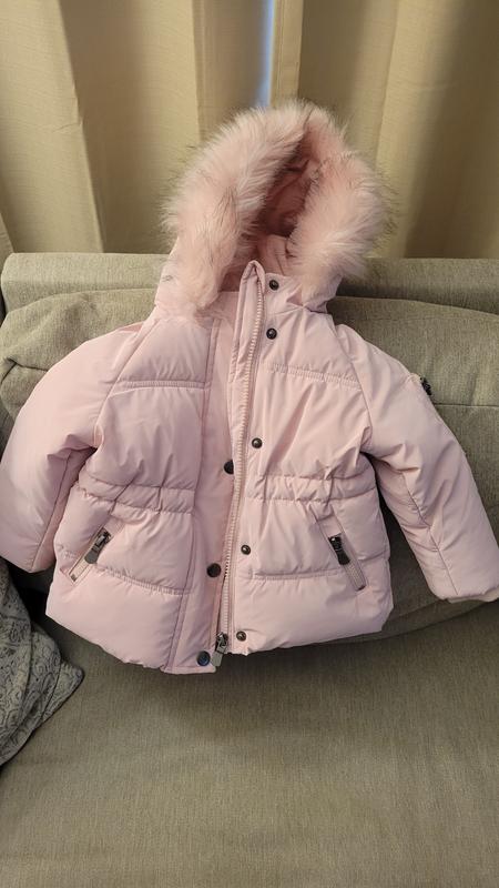 The coat is pink, very cute color. Looks and feels durable and warm.