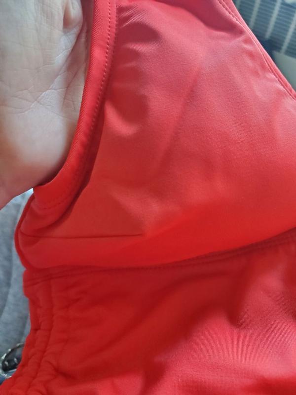 This bikini top is super cute, fits well and is comfortable! It fits true to size and the red color is great with any skin tone. It can adjust and fit if you need it bigger or smaller as well.