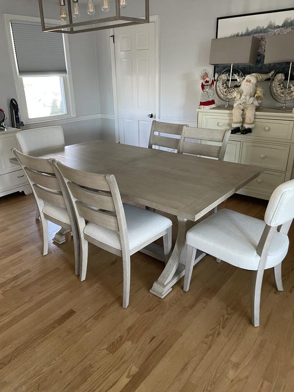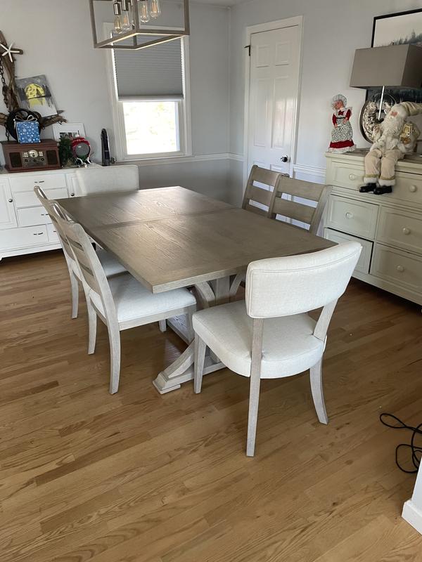 The table is very sturdy and well-built, with a solid weight that gives it a durable and long-lasting feel. The legs are substantial and give the table a grounded, high-quality feel. I also love the size —it’s large enough to comfortably seat six people, perfect for family dinners or entertaining guests, and the table leaf goes in with ease without overwhelming the dining area. The chairs are just as impressive. The cushioned seats are comfortable for longer meals, and the neutral upholstery pairs beautifully with the wood. I appreciate that the chairs feel supportive yet not bulky, which keeps the space looking open. Overall, this table is stylish, functional, and very versatile. It strikes the perfect balance between casual and elegant, and I’ve already gotten several compliments on it. Highly recommend if you’re looking for a dining set that feels both inviting and timeless. Shorter version Beautiful, sturdy, and versatile dining set. The light wood finish is modern yet warm, the chairs are comfortable with neutral upholstery, and the size is perfect for seating six without overwhelming the space. Highly recommend!
