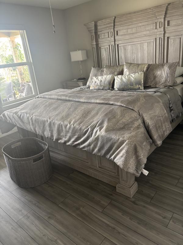 This Rensia Pillow beautifully highlights the allure of modern ombre art in soft silver tones, ideal for today s bold contemporary decor. A distressed, shimmering beige finish adds a chic touch to this high style accent, and a zipper closure ensures easy access care and cleaning.