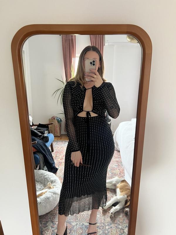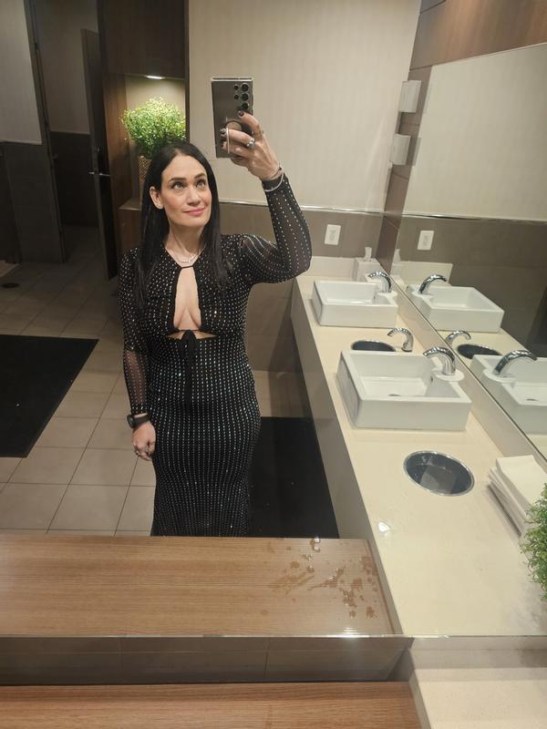 I got this for my husband’s holiday party and it was perfect! The sleeves are meshy with the same bedazzles design. I like that I can wear it multiple ways for different occasions! I am 5’2” and it fit more floor length for me (rather than a midi) which is what I’m used to and wanted! I ordered a size small and am 125lbs.