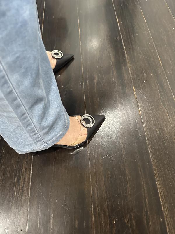 This shoe is gorgeous. The heel is not extremely high and the shoe itself is not painfully narrow. The add on of the stones and glass shoe look makes this shoe great for formal wear as well as for a splash of fancy with a good pair of jeans. I love them