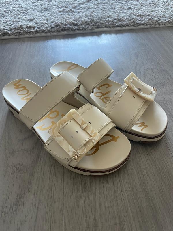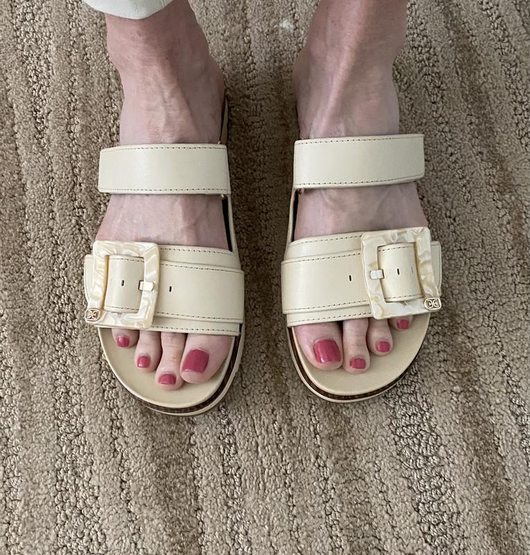 I have had a similar pair of Sam E. Sandals and loved them and these are the replacements! I can’t tell you how many compliments I get with either pair. I like the upgrade with the faux buckle!