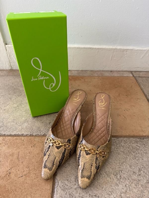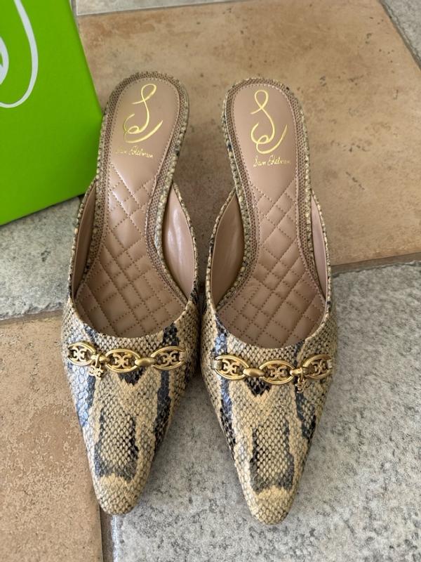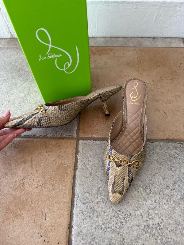 I LOVE these shoes. I have a wide foot so the mule aspect is great for me. They feel comfortable and not super narrow in the toe box. The snake skin pattern is so chic and great to wear with jeans, work pants or a simple dress to elevate a look. The gold accent is very subtle. The one thing I noticed is they are not walk fast shoes for me or I will be slipping right out of them. More for sit down affairs or a leisure stroll in my books.