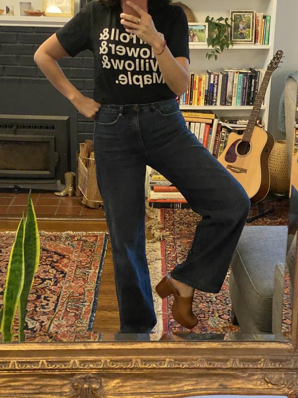 I have never been able to do wide leg jeans before because I have short legs (5'2", longer torso, shorter legs) and most flared or wide leg pants just swallow me and look cartoonish. I'm not sure what about the cut of these is different, but they look so great on! They fit comfortably in the waist and the hips, and the legs then just come straight down. They make my legs look long and not lost in fabric. Minor things, but still definitely worth mentioning - the pockets are a good size, not miniature, and the zipper zips up and down smoothly. The denim is soft and very high quality. The dark wash is a nice color that goes with everything I've put it with so far, not overly blue. The only negative about these is that they are soooo long. I had to get an inch and a half hemmed, and I'm still wearing them with heeled boots.