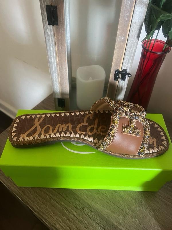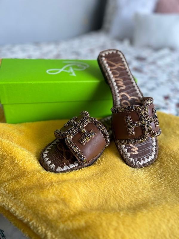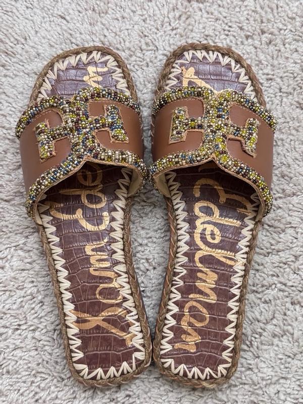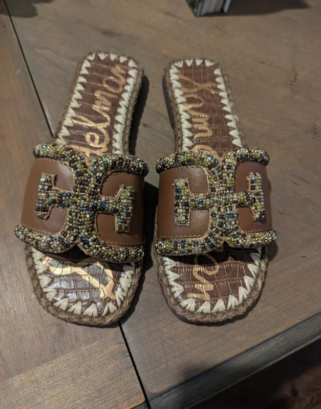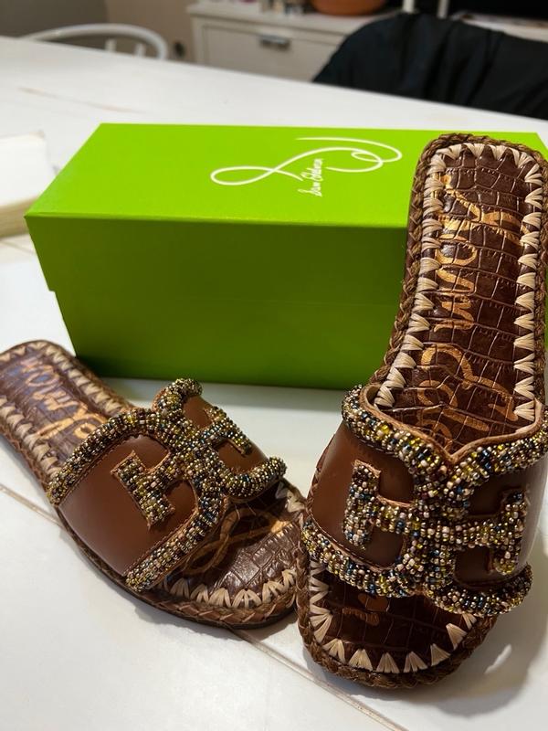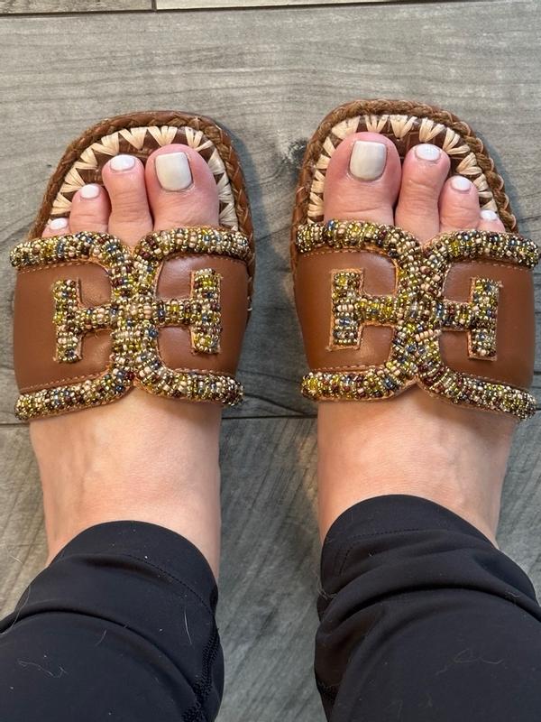 Loved these sandals, even better in person. The beading is so pretty, browns and a touch of blue. The stitching around sole added extra touch. So comfy on top of foot, very unexpected. My favorite brand does it again. I own so many pairs over the years but this is my favorite