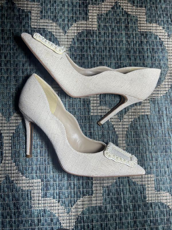 Beautiful linen shoes, very comfortable considering the heel height. They are linen texture in a coral color which seems to blend with warm pinks and peach. I love the beads on the heels. It's so unique!