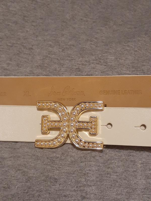 The new Sam Edelman - Women's Imitated Pearl Embellished Double-E Plaque Buckle Belt is a must have. It’s so very classy and elegant. I’ve only worn a handful of times and received so many compliments already. I love that you can dress it up or wear it with your favorite jeans as shown. It very similar to the high end belts at a fraction of the cost. It bugles so way and sits right on top of your hips. The quality is great and the black a perfect shade! Sam Eldeman has done it again! You will not be dissatisfied.
