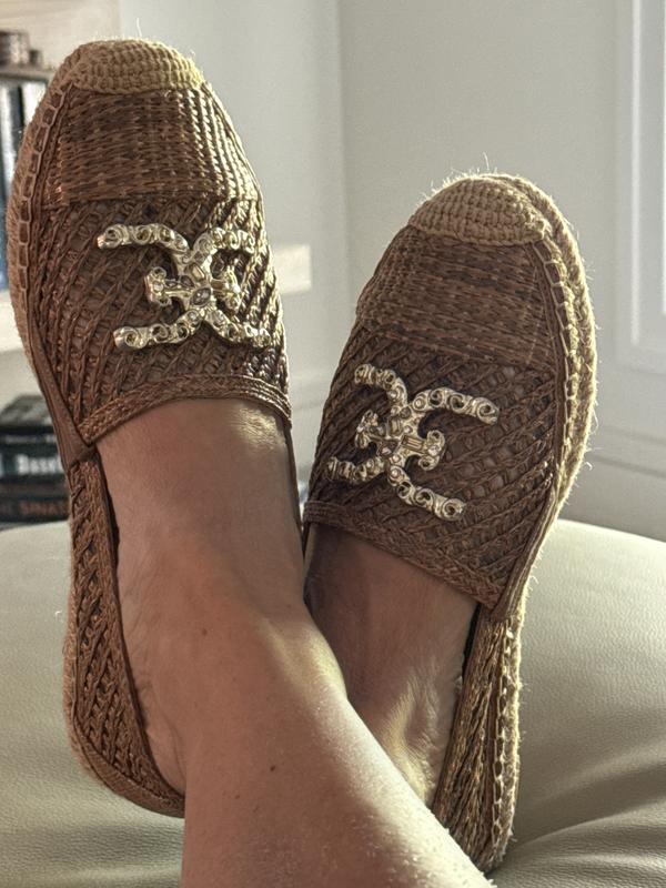 These shoes are the bomb! Boho yet classy rafia wrapped yet elevated with the gorgeous logo. The insole is cushioned and comfy. Based on previous reviews I downsized from my usual 9.5 to a 9 and the show fits perfectly. I could wear them all day. This is a revamp of the classic espadrill loafer!