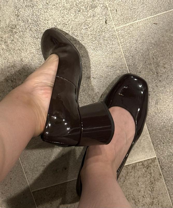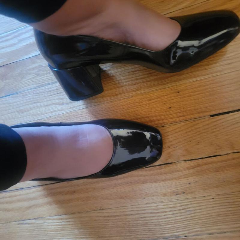 I really like this shoes. Has great support. I think it is true to size although I was thinking on wearing them with tights and I think they might be coming off a little bit. I really like the color and the block heel. They’re comfortable to walk in.