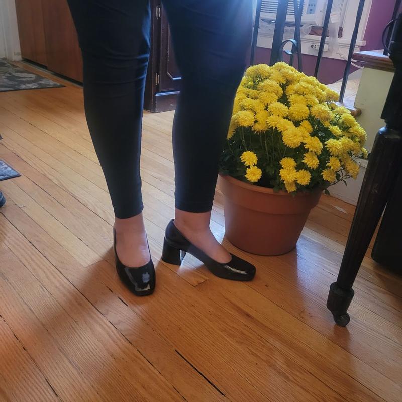 So cute and comfortable! It’s a very unique but also traditional looking heel. The toe gives baller flat? The color is also so perfect for fall. Thick heel in the back which makes it super comfortable for standing all day or long days at work. Would definitely recommend!