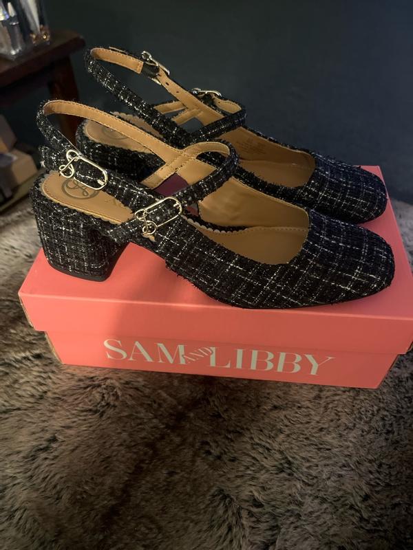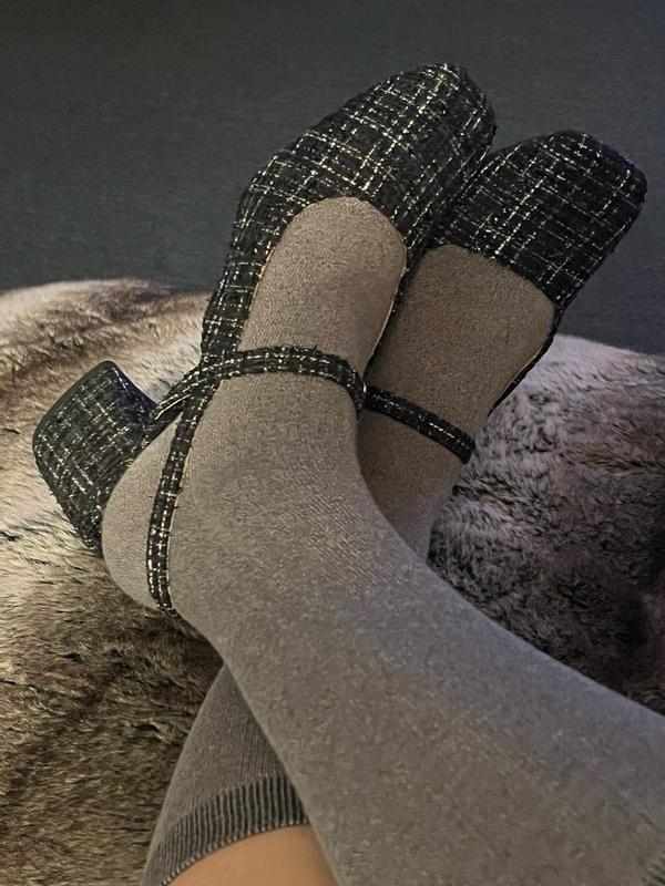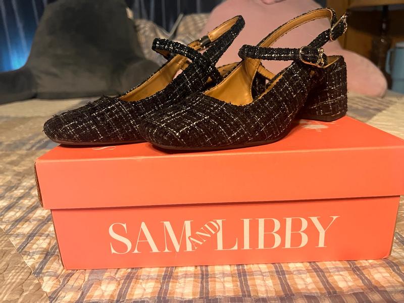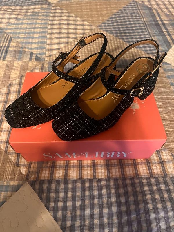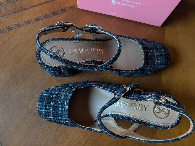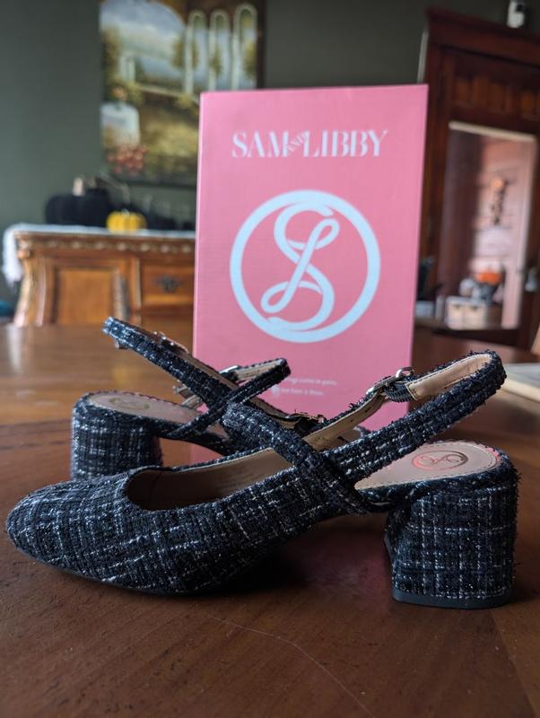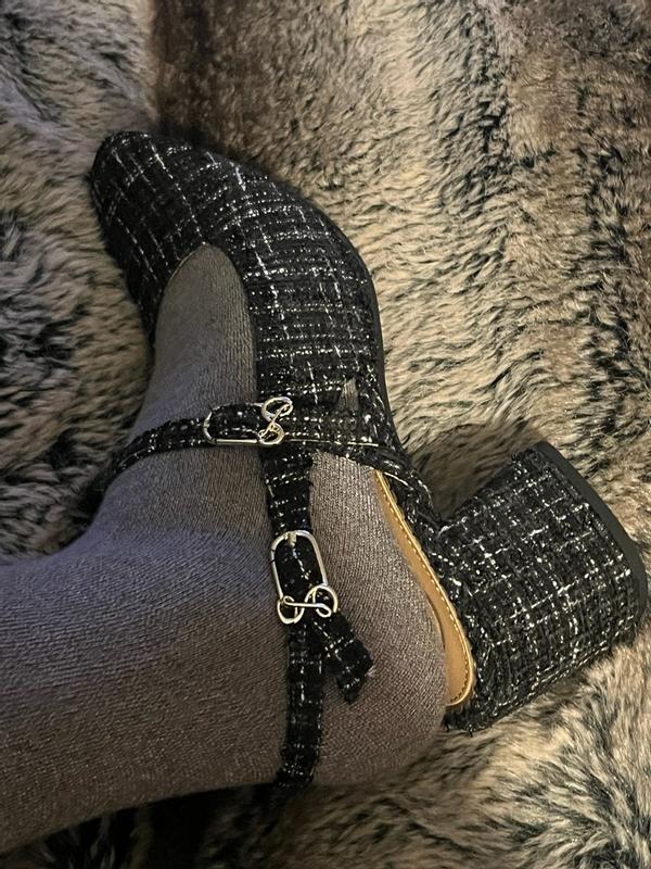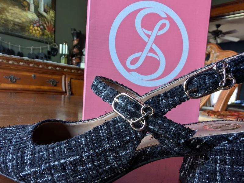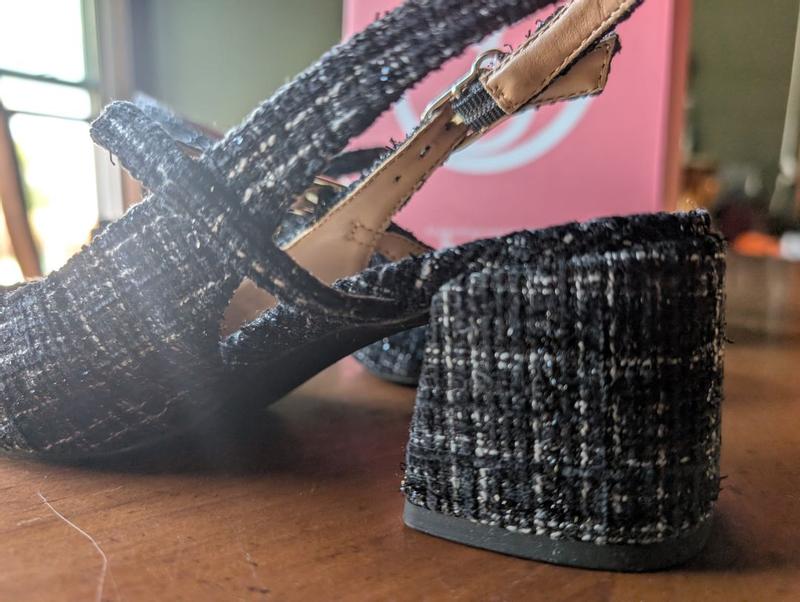 Cute shoes for a holiday party, the heel is comfortable, but the front shape of the shoe makes it a little uncomfortable and it’s not flattering. I do love the material on the shoe and the little details on the closures.