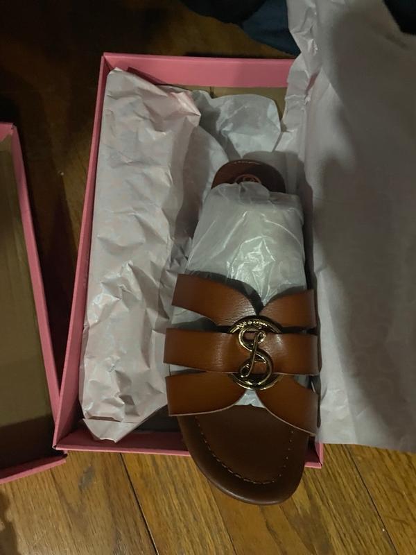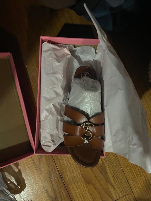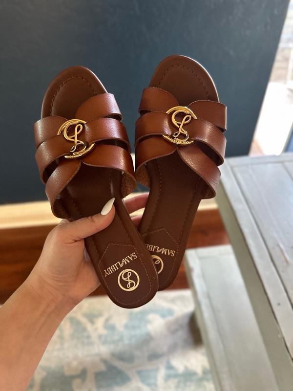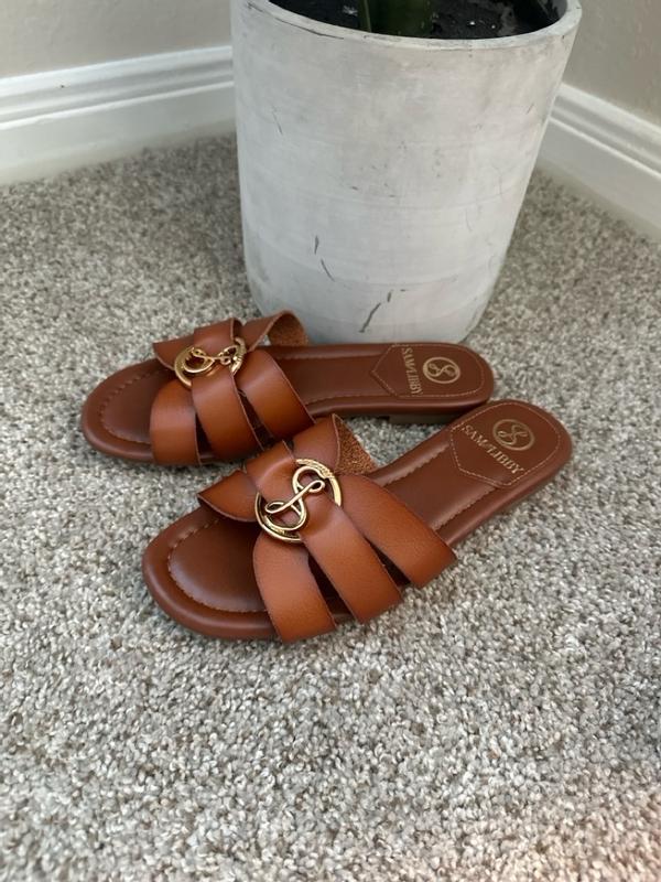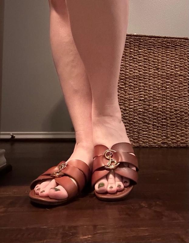 Purchased a month ago and very pleased with these S&L sandals. The sandals arrived well packaged. The color is more of a cognac which I prefer. The Gold S&L medallion hardware is very nice and gives the sandals a classy look. I ordered my size 8 1/2 (they do not run short) and the fit is true to size. The width is not narrow which worked for me. The inner sole is slightly cushioned and comfortable. They are faux leather which I prefer but do look leather. They are comfortable and well made.