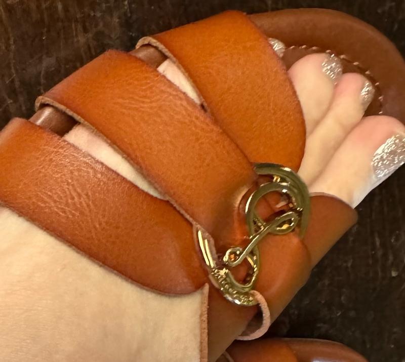 These cognac colored sandals are beautiful. Very upscale looking. Great price point and even better on sale. Not real leather, but they are soft on the sides and top. The only drawback is they run wide. If you have a narrow foot, you may want to size down. I am a 9.5 with a very narrow foot. When I received these, my foot was swimming in them and offered little support. Because they are so pretty, I returned them and have sized down to a 9. Haven't received yet, but I hope the 9's work. These are flat sandals with not a lot of cushion, but enough to be comfortable. Probably not good for walking long distances, as there is no arch support.