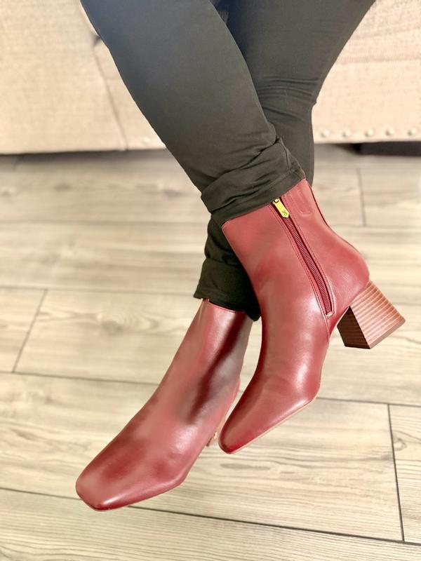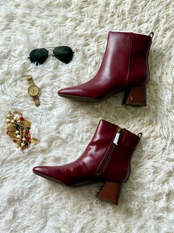 Okay, I have to talk about these Sam & Libby Yuliana Ankle Boots! I got them in the Swiss Mahogany color, and I am absolutely obsessed. Seriously, the color alone makes these feel so expensive and high-end—it’s this deep, rich wine/burgundy shade that works like a neutral but has way more personality than plain black. I was a little nervous about the heel, but it’s a perfect stacked block heel that's comfortable for running errands all day. It gives just the right amount of height without making my feet ache. The pointed toe gives them a really polished, sharp look. They look amazing dressed down with black leggings or denim, but they're also chic enough to wear with trousers for a work look. If you need a versatile, comfortable, and seriously gorgeous boot for the season, look no further. The Swiss Mahogany shade is the move!