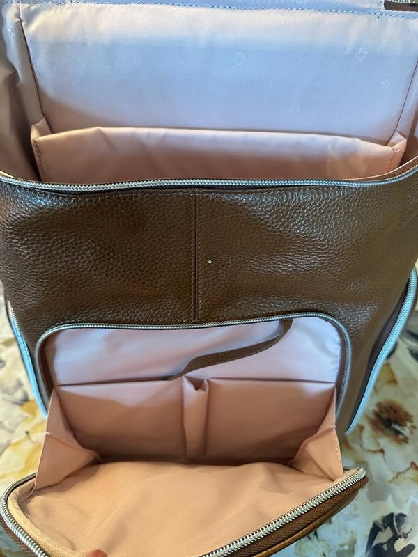 This bag is super cute and so functional. It feels very well made and durable. The leather material is chic and feels high quality. The color of the bag is so subtle and it matches well with any outfit. I love the pink interior lining. The functionality of the pockets and luggage strap make this a great bag.
