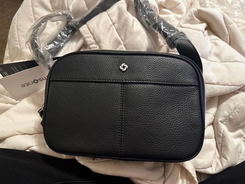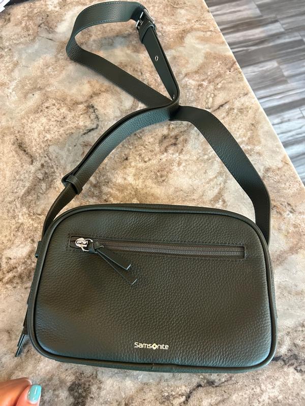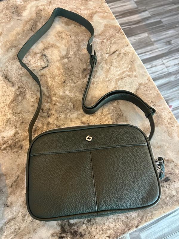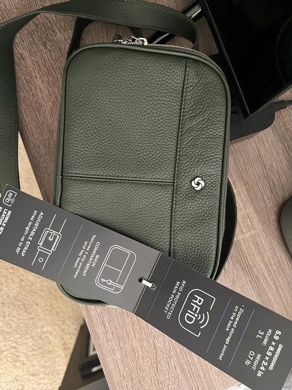 Love the olive green color of this bag. The RFID blocking technology makes it great for traveling overseas. Love the size of the bag as it is perfect for travel. Will fit your essentials such as phone, important travel documents and some makeup. Leather is a nice quality and comfortable to wear as a crossbody or over your shoulder.