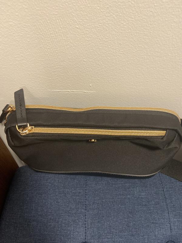 I am so happy with this purchase. It is exactly what I was looking for to compliment my Samsonite backpack. When I travel, I use the backpack for my laptop, cell phone, charger, fleece, sunglasses, water bottle, wallet, lip balm, and more. It's amazing how much fits in there and still looks slim and sophisticated. I love my backpack; however, in the evening, I don't want to carry it to dinner. This waist bag can also sling across my body. It's large enough for my full wallet, cell phone, a compact, lipstick, and keys. The larger compartment has a wide zipper range so it's easy to get in and out of. I love it! I recommend it!