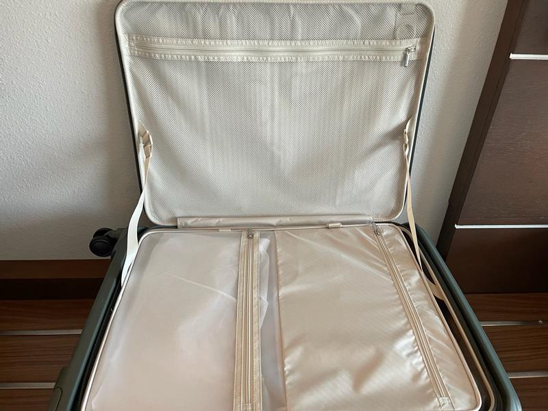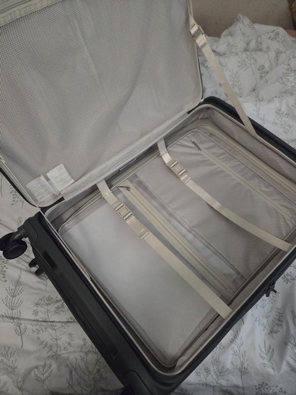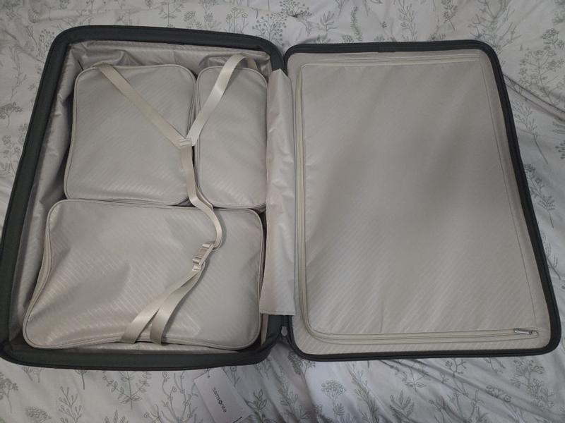 Just received and luv allbthe extras! From the 2 locks, easy access front compartment, and all the extra bags for compartments if you like to separate ur belongings. You do not have to use them but im sure we will. I did get the light grey so we will see @ any scarring from being in a luggage compartment, but it is pretty amazing. It runs so smoothly on the floor, not high carpet, my son is jealous. It also fits all the guidelines for size. Just under 62 L ! Very excited to use!