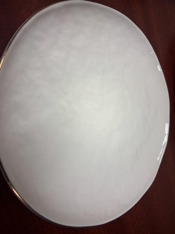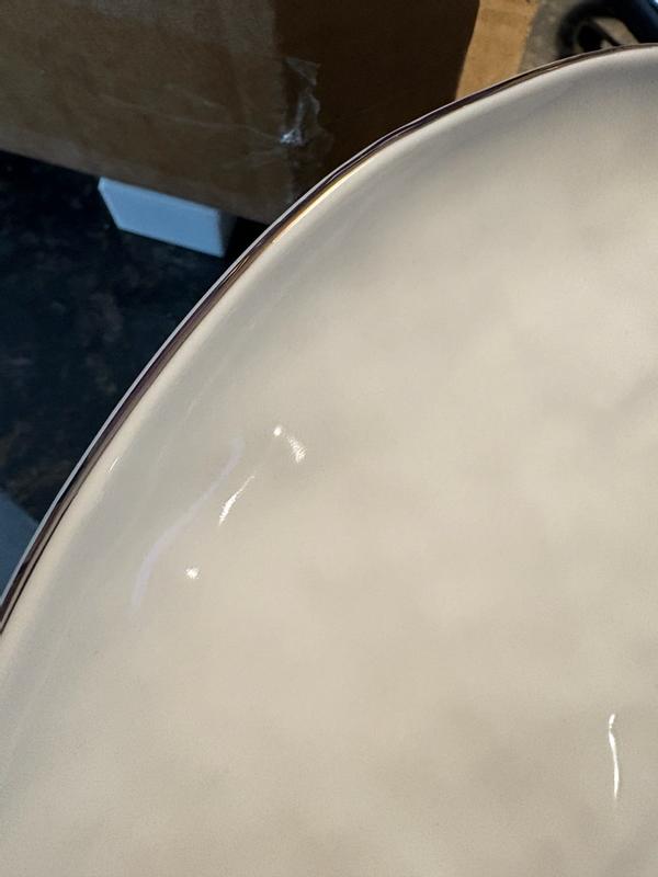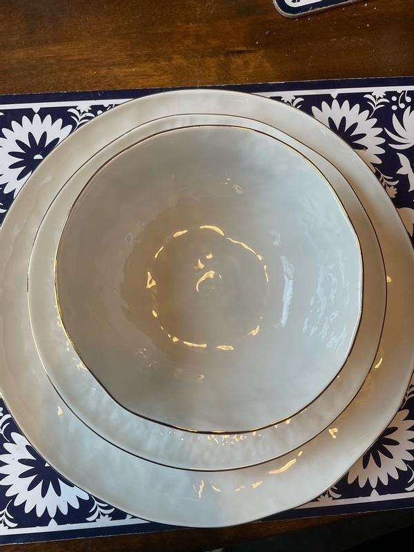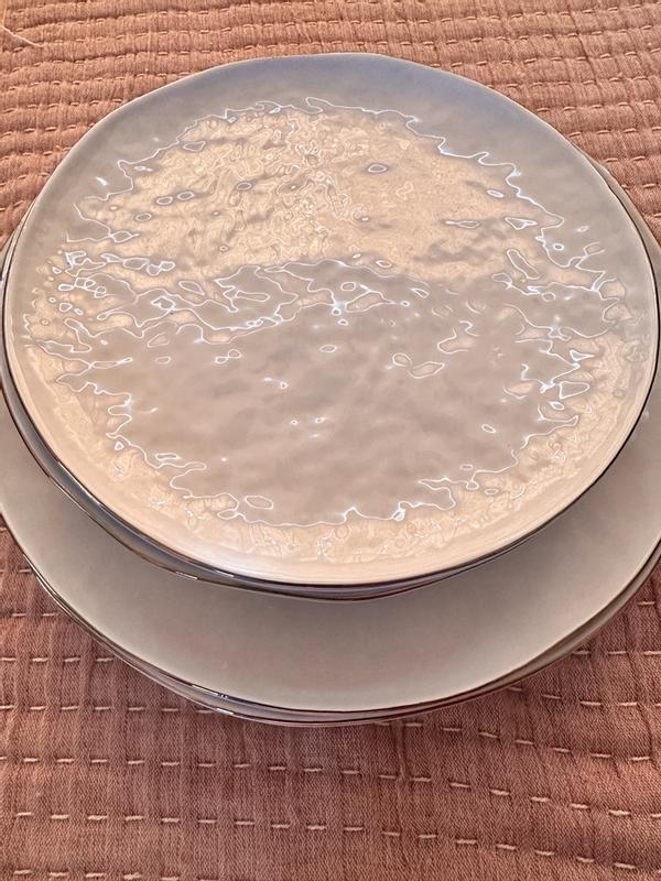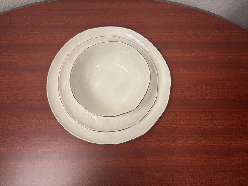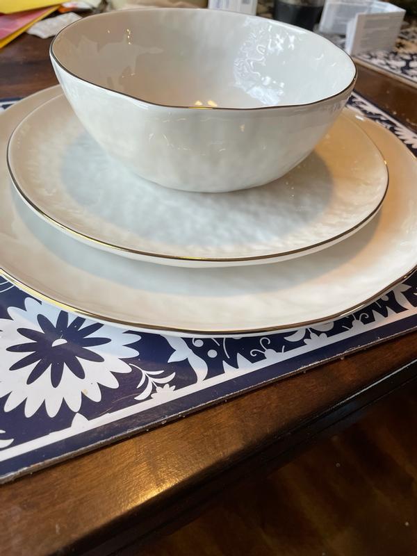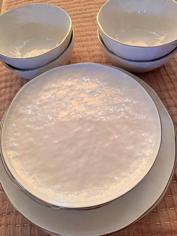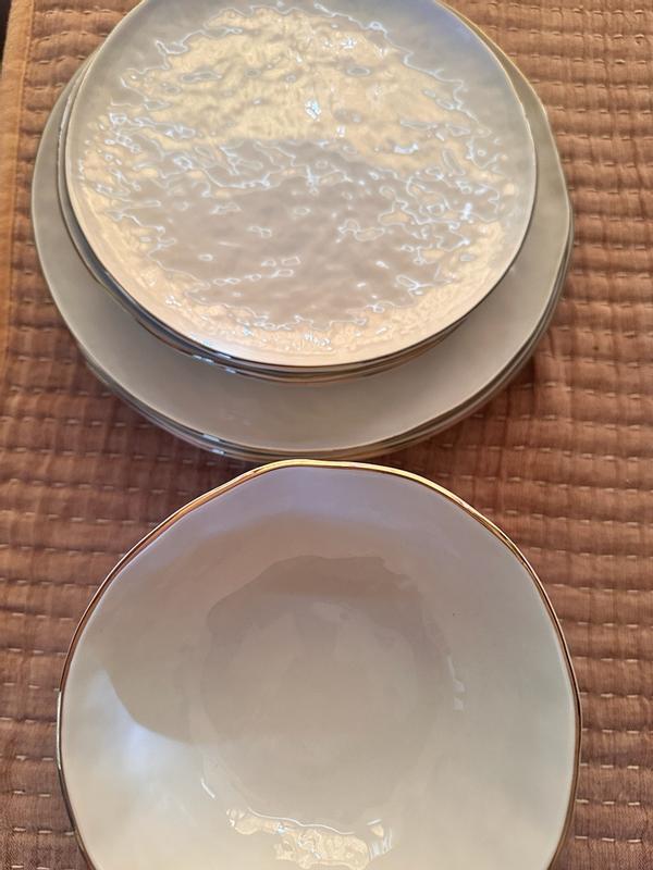 This dinnerware is so pretty. There is shiny gold along the edge of each item but yet dishwasher and microwave safe!!! The gold is so pretty in combination with the glossy subtle texturing on the plates. The plates have a classic look with a modern twist with the angled edges. Gorgeous!!