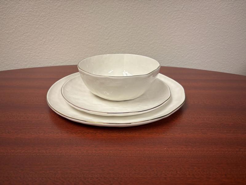 This dishware set is super nice, but practical. It is white with gold trim giving it just enough detail to be good enough for special occasions, but still good for everyday use. They are dishwasher safe and thick. They are designed well and durable.