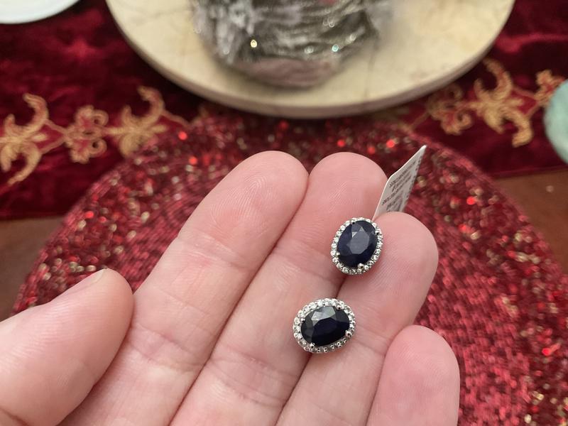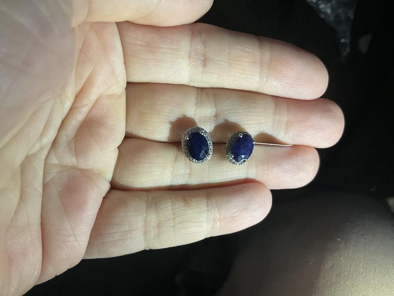 Got these earrings on sale for black Friday and this is what convinced me to keep them. The stone is a little darker than the picture on the website but it is still lovely. Love the diamond halo around the sapphire. I've used them every day for a couple of weeks and so far no issues. I would recommend. I bought a ring from Macy's that is very similar to the earrings and I am happy with both purchases. I would definitely wait and buy on sale.