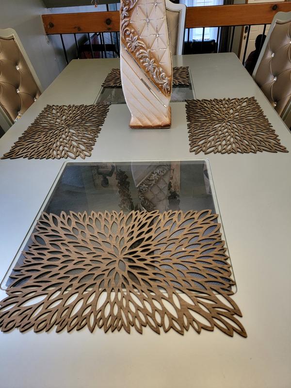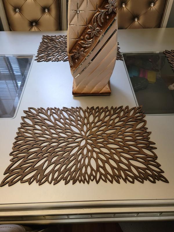 I love the designs of these placemats. They are beautiful! They work well with the decor in the dining room. They do not move around as much and stay in place. I would recommend this product to any and everyone because they are so unique and beautiful and the durability is amazing. One downfall is they are hard to clean because they are wood other than that they are great!