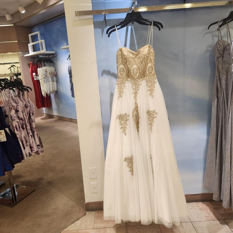 My daughter tried this dress on at Macy's in Downtown Summerlin but it was too big. They did not have the next size down available to try on and potentially purchase. I found the dress on my Macys app and had it shipped. The dress arrived in a box folded over on a hanger with some clear plastic wrapped around and then tied in a big knot on the bottom of the gown. As my daughter pulled it out to try it on, she noticed all these sequins/rhinestones missing off of the dress. There were 15 which were laying in the plastic. The clasp above the zipper was bent and hanging by a thread. As she slipped the dress on, I noticed the bottom of the dress was greyish as if it was dragged on the ground. Clearly this dress was not new. Perhaps it had been tried on several times and was paraded around on a dirty floor. Very disappointing for what should have been a beautiful dress. I am a long standing customer with Macy's. Never have I ever been so disappointed. No response to date.