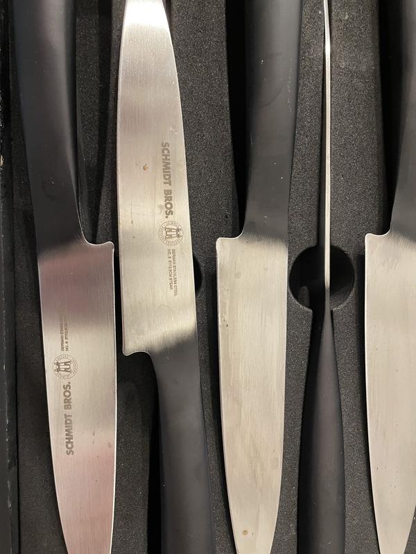The package arrived intact with a slight ding in the external packaging. No big deal, as the internal packaging was perfectly intact. Upon opening, however, one of the knives had become unmoored from it's protective foam bedding. Still, after inspecting them all, there is no damage to report from shipping. That night, I cooked up a steak from a local farmers market vendor--Pittsburgh-rare, just the way I like! Upon taking these new Carbon-6 steak knives to task, they immediately feel "lacking". While certainly balanced individually, the handles feel hollow (let's face it, they are) and that gives the impression that these knives are blade-heavy. The last thing anyone at the picnic table wants to experience is a knife falling blade-side-down toward their feet. But with these knives, that is what is most likely to happen. The non-serrated blade is a godsend for those who love to sharpen their own knives. (A stone, a steel and a strop will keep these sharp for every single use!) But if a set of steak-knives--a luxury purchase, to be sure--don't feel magnificent in your hand, then what's the point? Make these dinner-service blades full-tang, and with a bit of heft... and you'll have me as a customer forever. For now, however, they're just... okay. The look is sexy, the feel is not.