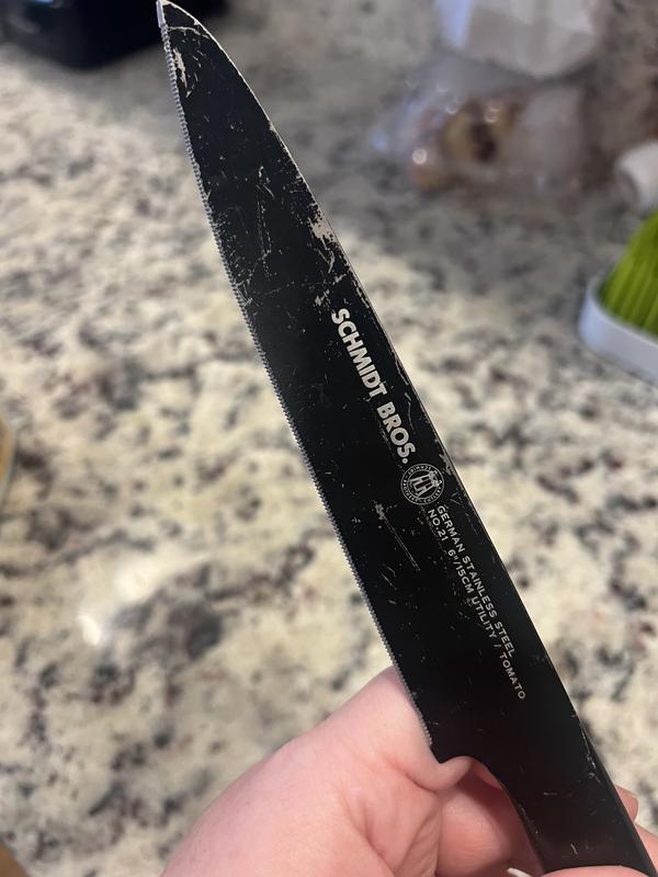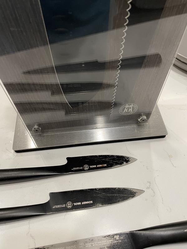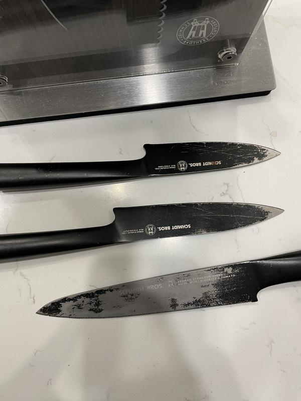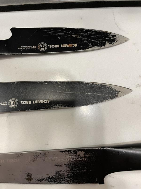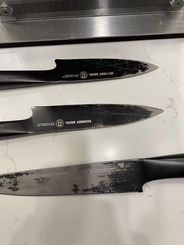 Hi Jules! We're so sorry to hear about your experience with our Jet Black 7-Piece Knife Block Set. Please reach out to our customer service team at info@schmidtbrotherscutlery.com with pictures and we’ll be delighted to help resolve this.