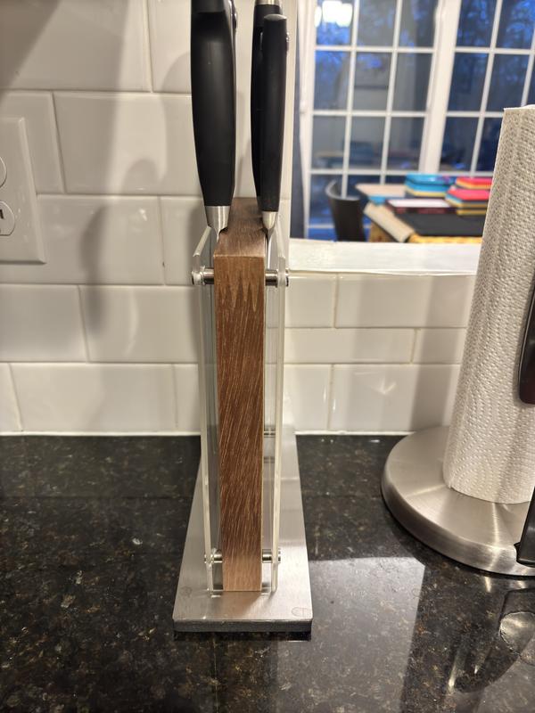 This takes the place of the wood knife block that took up a lot of real estate on my counter. The slim vertical footprint is a real game changer. It’s easy to use and a great look for the kitchen!