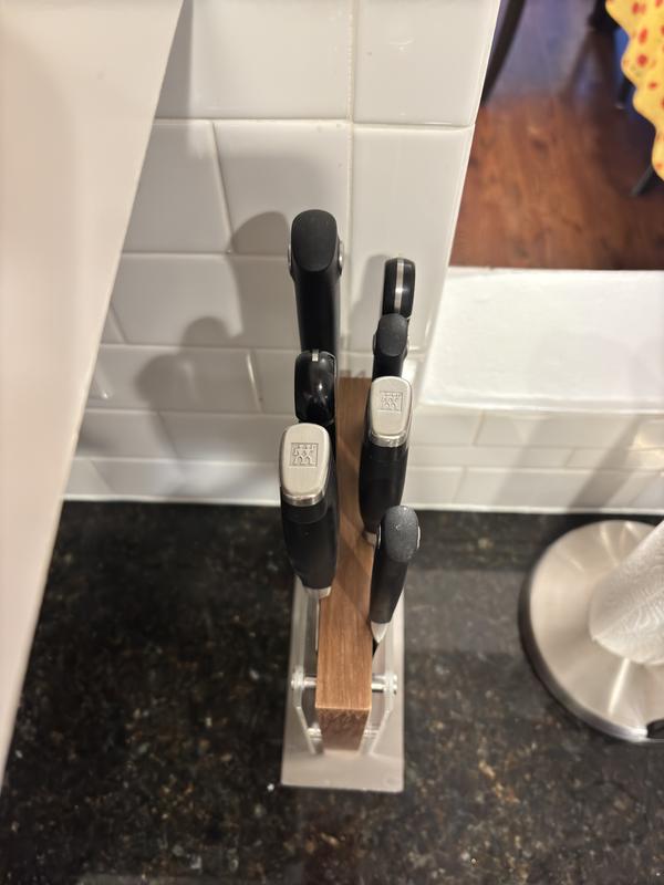 This takes the place of the wood knife block that took up a lot of real estate on my counter. The slim vertical footprint is a real game changer. It’s easy to use and a great look for the kitchen!