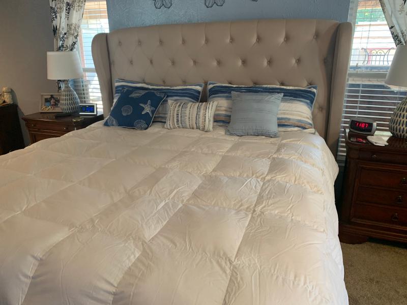I received the Scott Living 233tc Cotton Down Fiber Comforter - All Seasons to Extra Warmth for my queen sized bed. It fits my mattress perfectly the measurements are 90" x 90”. The outside is made from %100 cotton and it’s soft but cool to the touch. The inside fill is made with Freshloft with %75 white down fiber and %25 white feather fiber. The Freshloft process makes sure the fill is clean from allergens, dirt and dust-which is perfect for a person like me with allergies. I was afraid this comforter was going to be too warm to sleep with seeing how it’s summer but it actually kept me cool and comfortable. I love the style and off white color; it goes perfectly with my minimalist decor. I also like that it has the four corner loops in case I want to add a duvet cover. Overall, I think this is a very comfortable all-season comforter. I am able to fall asleep quickly using this. It keeps me cool (due to the fabric) but yet still provides the weight to keep me relaxed. I would recommend adding a duvet of some sort because of the comforter being dry clean only.