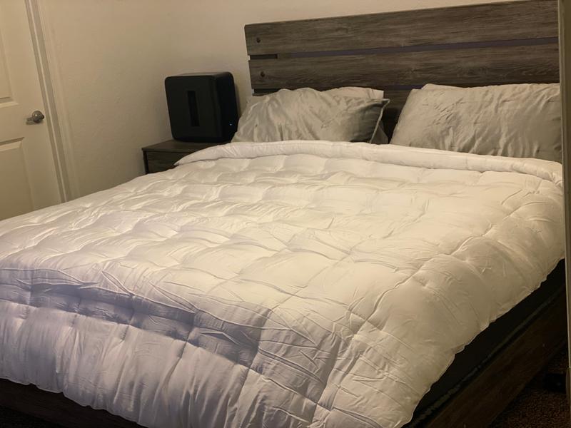 this comforter is amazing compared to any comforter I’ve bought before. keeps me warm but not too heavy. very fluffy and looks beautiful. would buy again