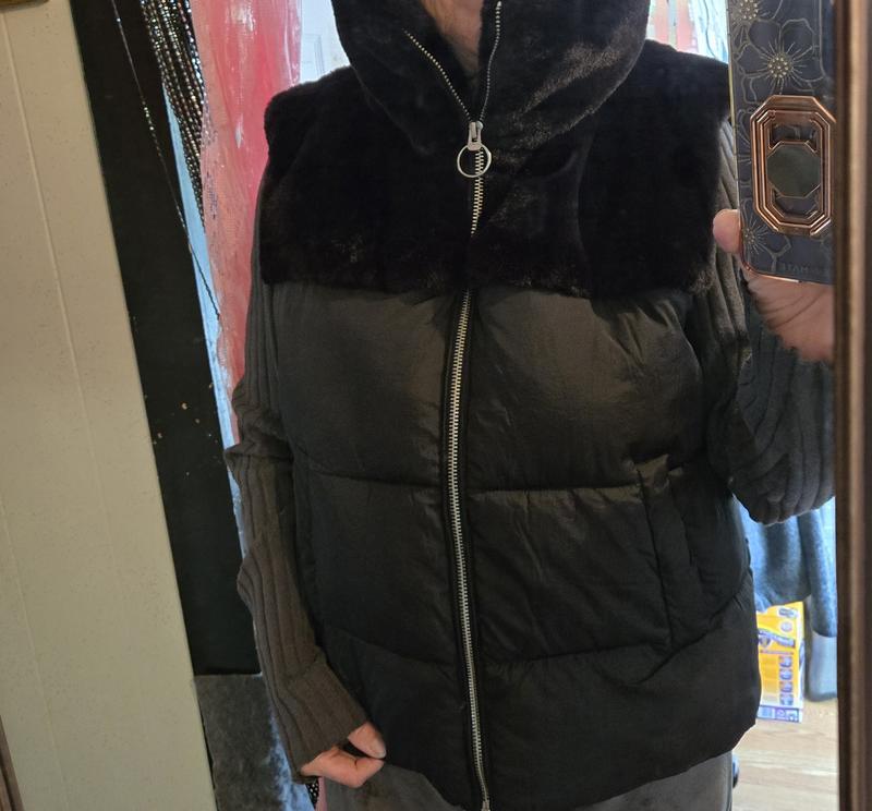 Web ID: 23670619This Sebby Collection puffer vest reimagines cold-weather layering with a cozy mixed media shell. Featuring quilted fill throughout for warmth and soft faux fur across the shoulders and collar, it blends texture with function in one easy piece. The zip-front design and stand collar make it great for layering over long sleeves or under coats when the temps drop. With clean welt pockets and an adjustable bungee hem, this vest delivers comfort, warmth, and modern style all in one streamlined silhouette.