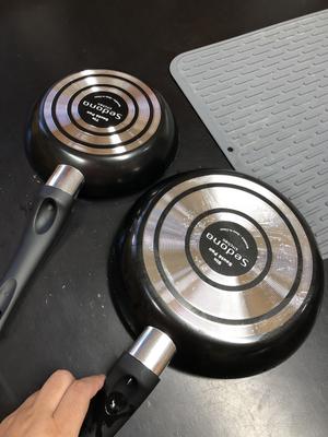 The pans do not weigh much and are easy to handle. The non stick surface is great. Foods slide off easily and they are easy to clean. The screws that are used to attach the handle to the pans came loose. I tightened them with a phillips head screwdriver. I hope that solves that problem. Can't complain. Nice pans for a great price. Thanks Macys.