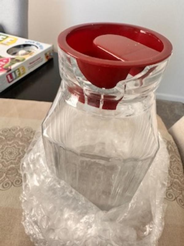 Pitcher arrived broken, shattered glass all over the inside of the box. The lid is super thin plastic that looks like it will break if pinched too hard. The glass walls are thin which caused the break.