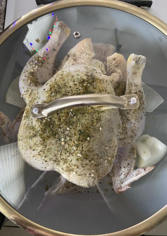 What sold me on this pan was how light it was. I had been using Dutch ovens that are usually cast iron. I am 68 and have trouble getting large pans on and off the stovetop and oven. I can move and lift this one with ease. I also love the color, it’s a soft light blue. Also cleans very easy