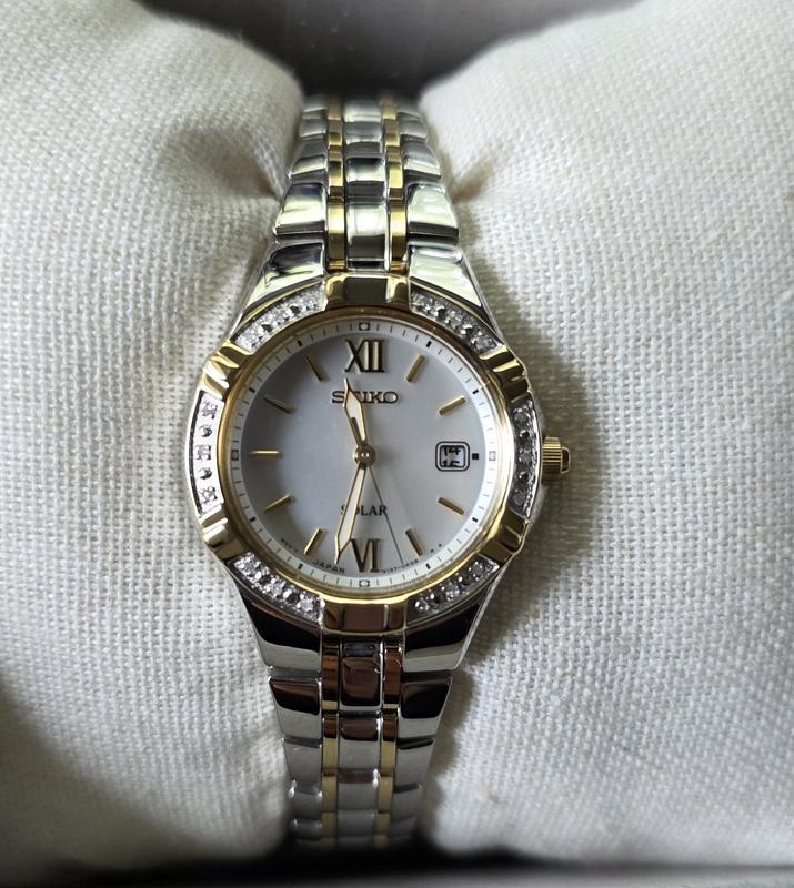 Beautiful watch. I had been looking at it for quite a while and decided to buy it finally. Very pretty in person. Diamonds are small but give off a nice sparkle. Not too heavy and love that it is solar powered. This is my first solar powered watch so will see how it holds up and keeps time. It is very big and needs to be sized. Will bring it to nearest Macys this week to have a few links removed. Very happy with it!