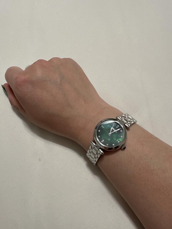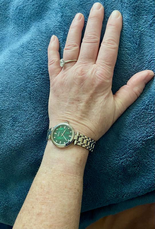 Gorgeous watch. Prettier in person. I’ve had it about 3 weeks and so far it keeps perfect time. I rely on the second hand for work (I’m a nurse). The mother of pearl face is a gorgeous deep cool green. The MOP flashes depending on the light and angle (will try to attach pics). It goes well with everything I wear, especially navy blue. I find the size to be flattering. I’m 5’7, size 18, but have a small wrist. I like that it’s feminine but not too small. I brought the watch to my local Macy’s for free size adjustment and they re-rang the purchase at a lower sale price, saving me an extra $50. I’m very happy with my purchase of this lovely Seiko watch.