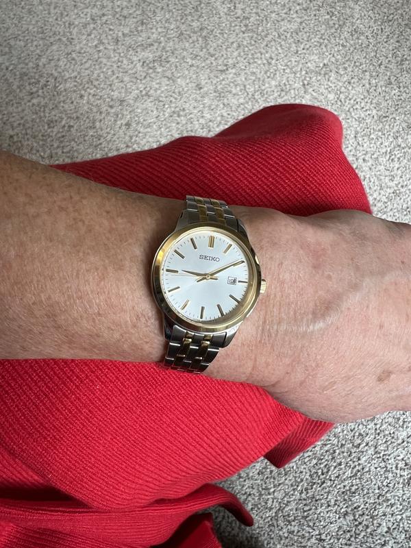This watch is perfect for me! I like a close fitting low profile watch and this watch did not disappoint. It is difficult to find a a good looking women’s watch that includes the date. The two tone is beautiful, it goes very well with my silver or gold jewelry. It is a watch that can easily be dressed up or down.