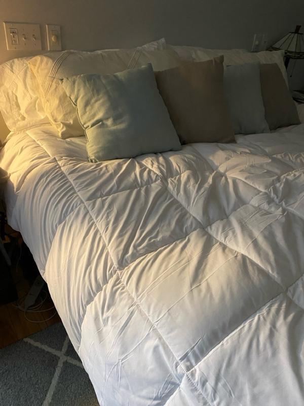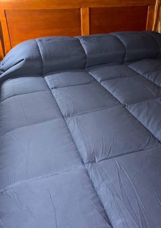 I love a good down comforter, but unfortunately my hot-natured husband does not. This one mostly satisfies both of us; not only is it super soft and lofty, it’s excellent at trapping just the right amount of body heat so he doesn’t sweat and I don’t get cold. It’s best for very cold nights; on some recent nights over 40 degrees F, he said it was too warm for him (but this is a man who sleeps with only a sheet normally). It’s a comfortable weight so we’re not lugging it around the bed when turning over like you do with a traditional feather comforter. I love the soft surface and that it’s Scotchguarded. Water just beads right up on it and doesn’t sink in, which is a plus with pets and kids for keeping it clean. I highly recommend this comforter.