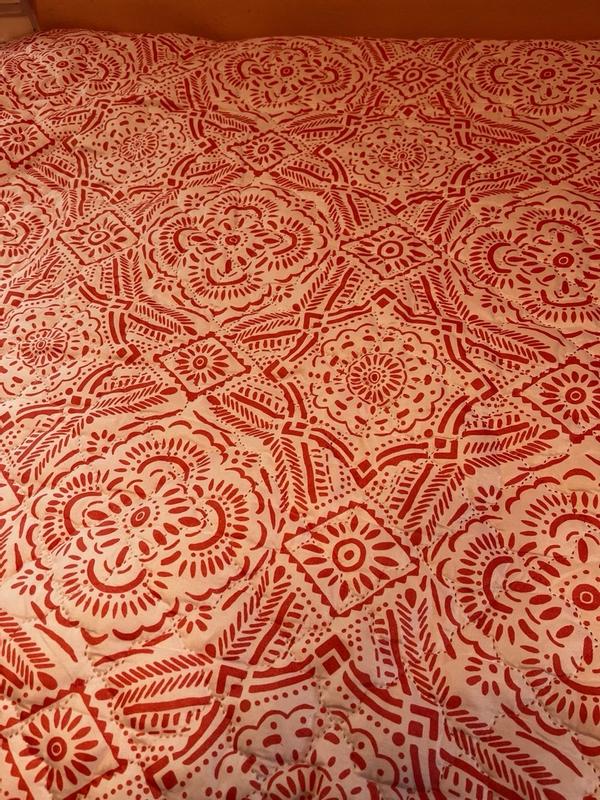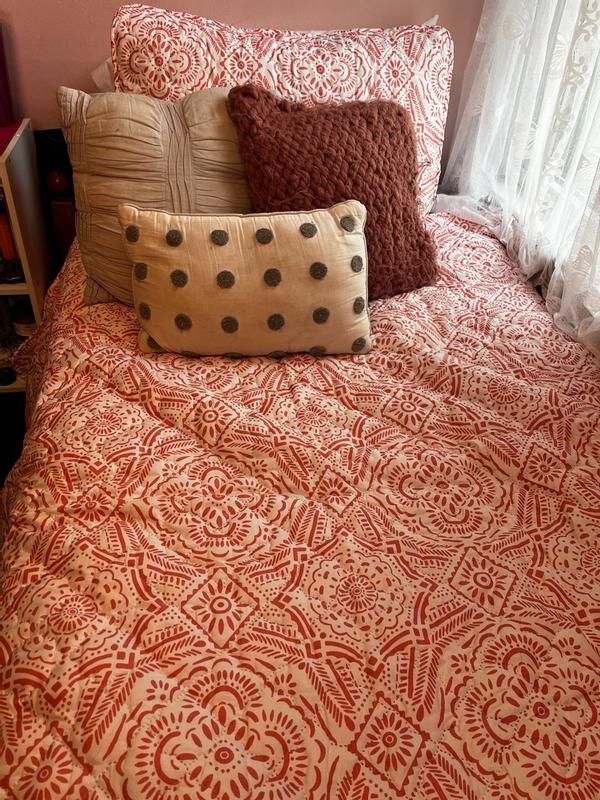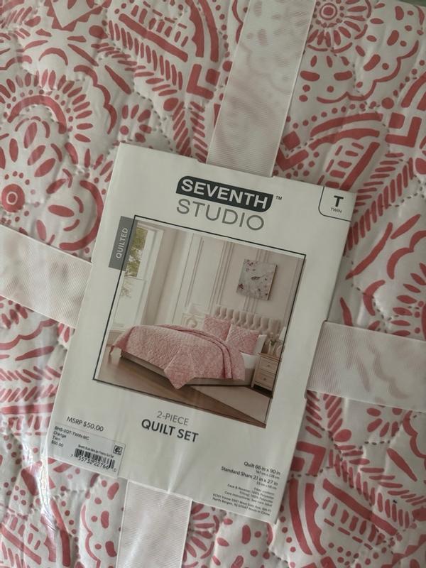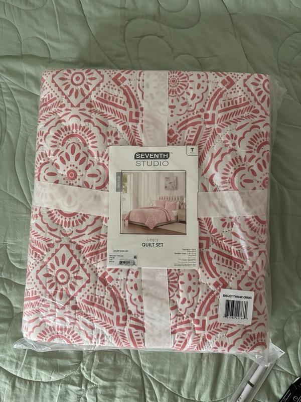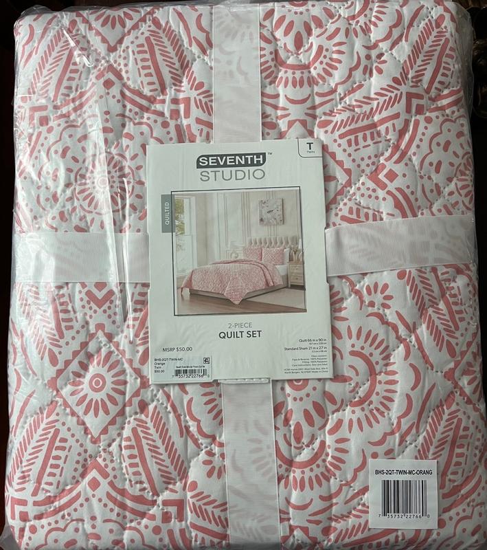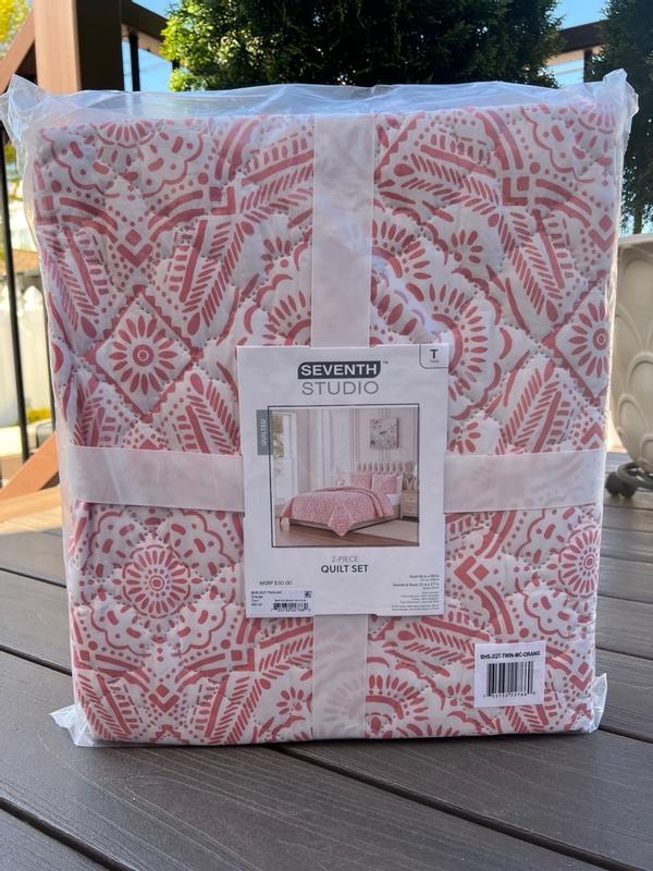 I was given the opportunity to try Seventh Studio Baja 2pc Pinsonic Quilt Set. This set fits a twin bed well. The label says it’s orange, but the color is more coral. It is lightweight which is good for the warmer months. It has a pretty design on it.