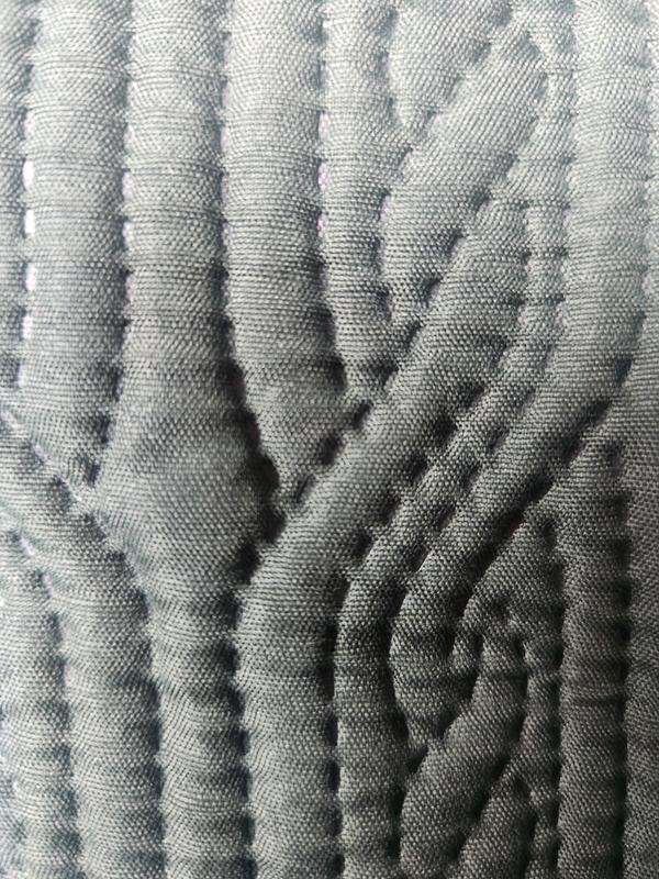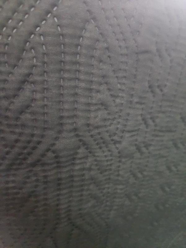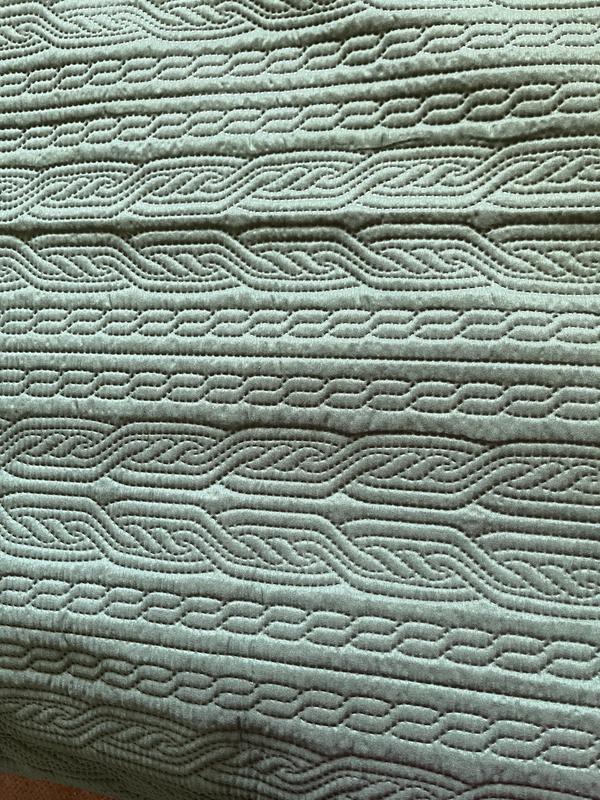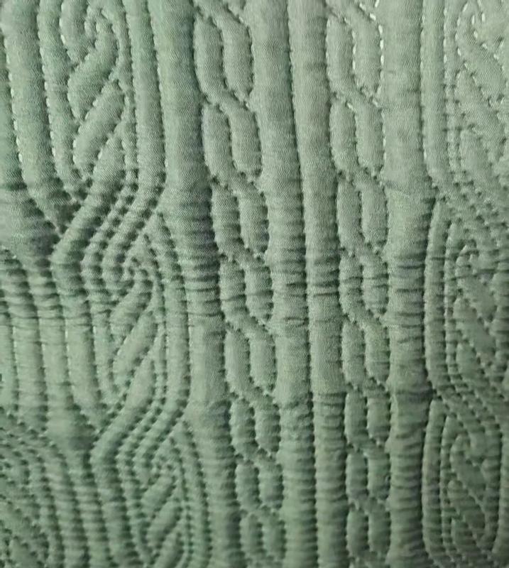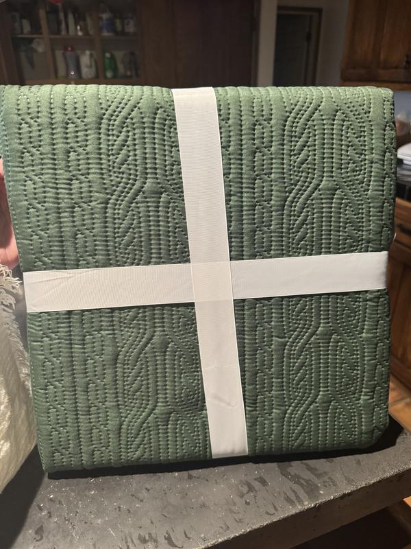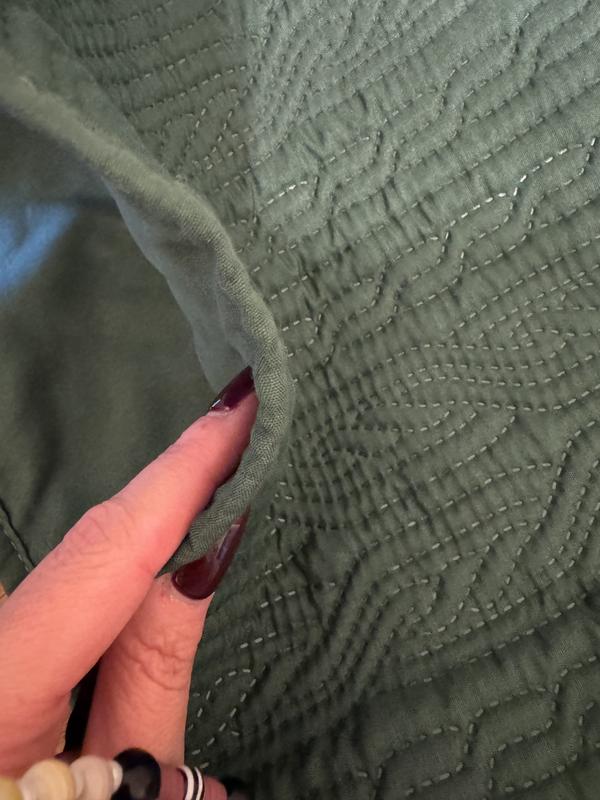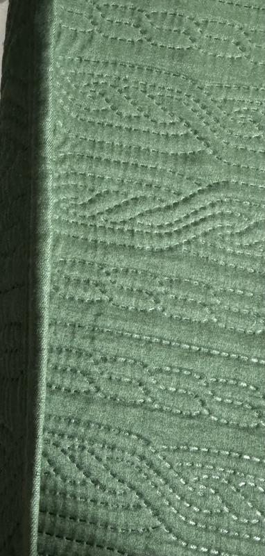 The color of this quilt is a pretty green. The stitching pattern adds a nice design to this quilt as well. The fabric is semi soft definitely more of a decorative piece versus an every day blanket. It’s a nice addition to any bed set.