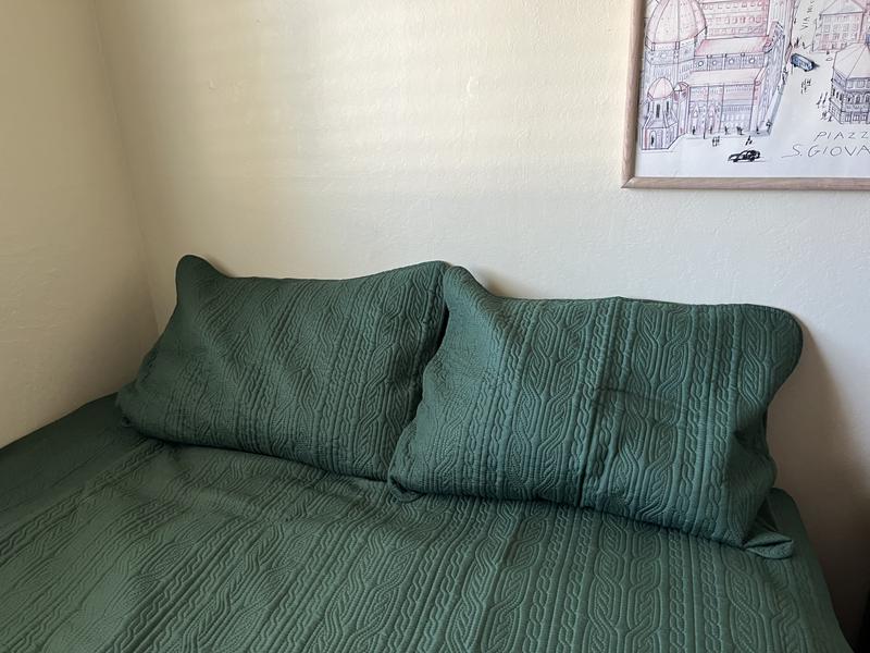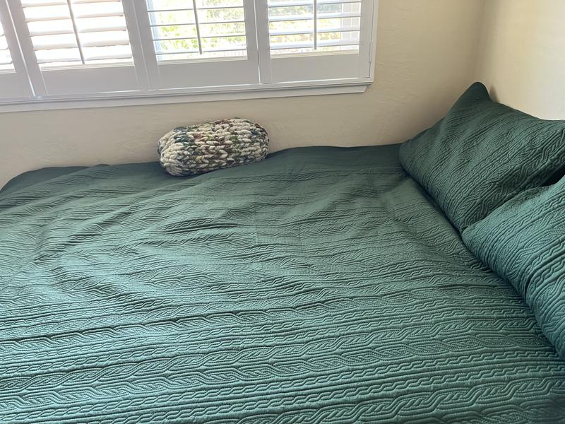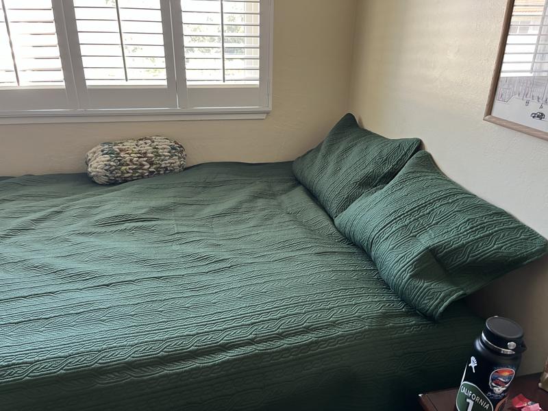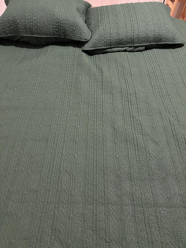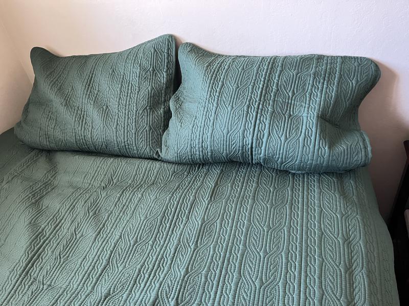 This is a simple quilt set, but it is beautiful. I chose dark green and I love it. Just in time to use it during fall season. It is very light weight and has good texture. It washes and dries well, the best part is that if fits on my washing machine and I don’t have to take it to the laundromat. 🫠 I recommend this kind of quilt set for those that like light weight material and simple stuff.