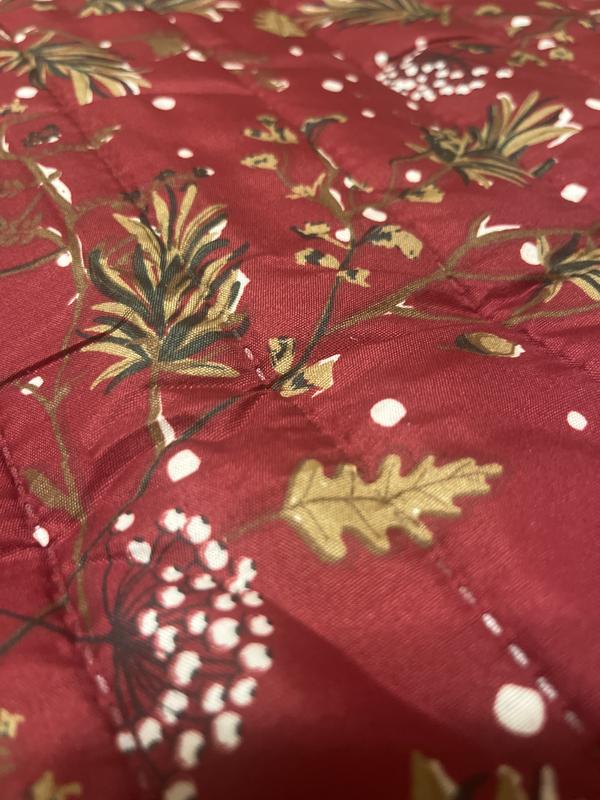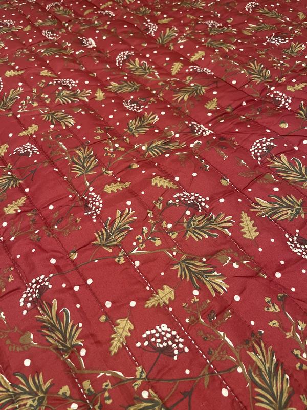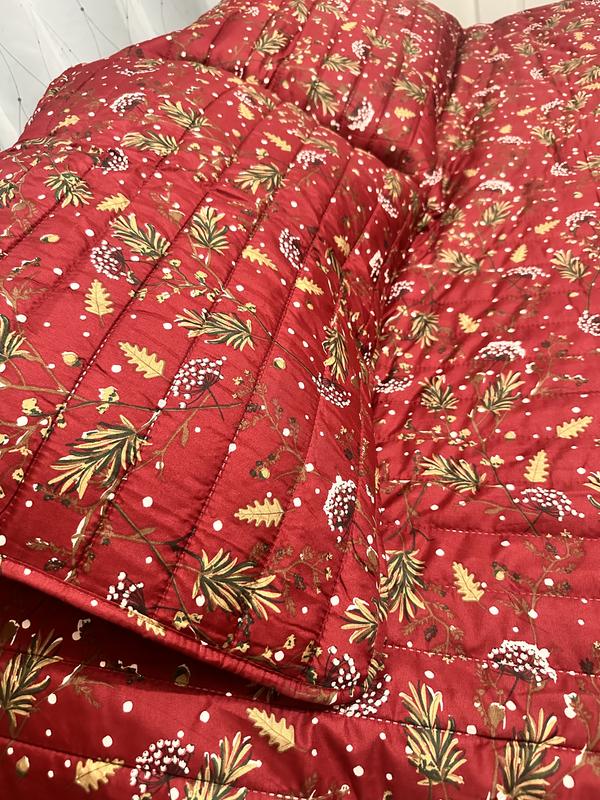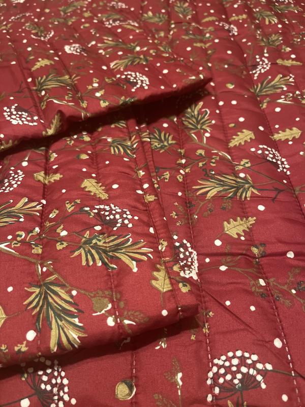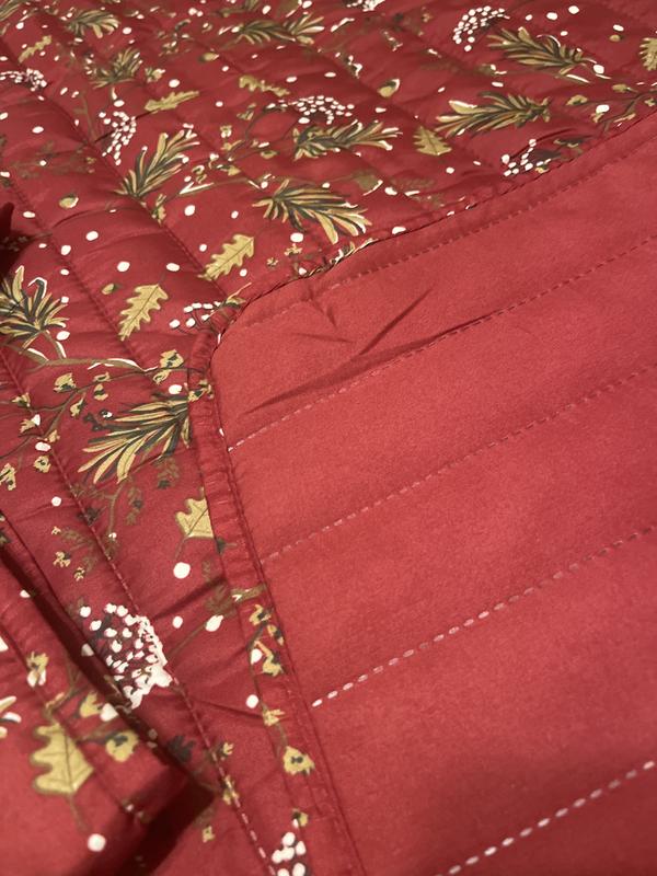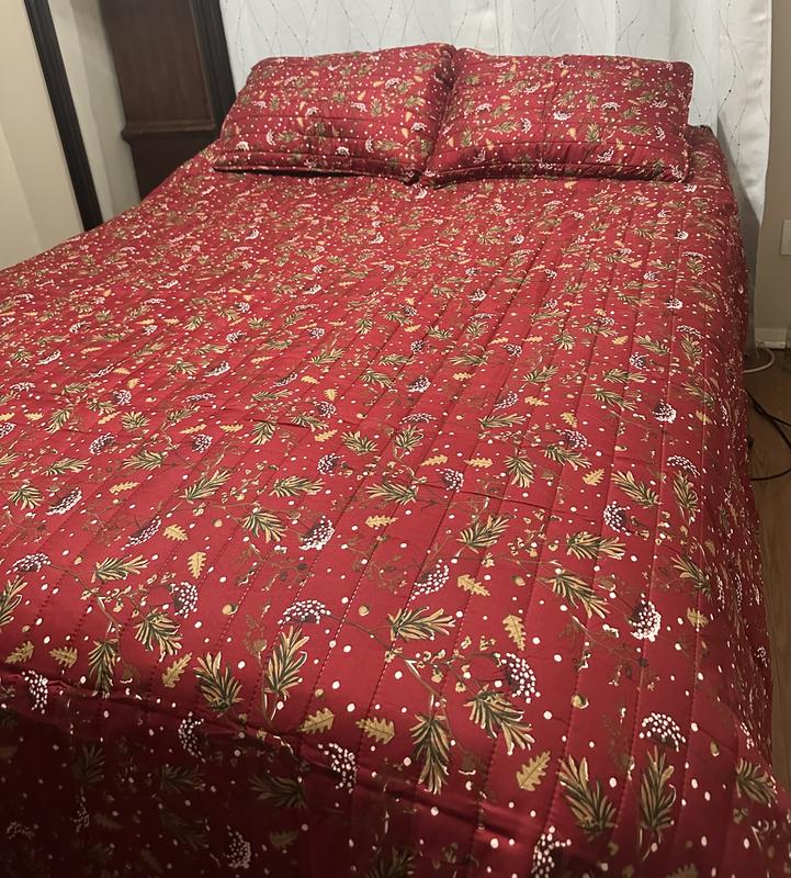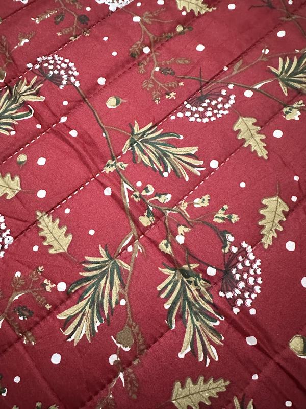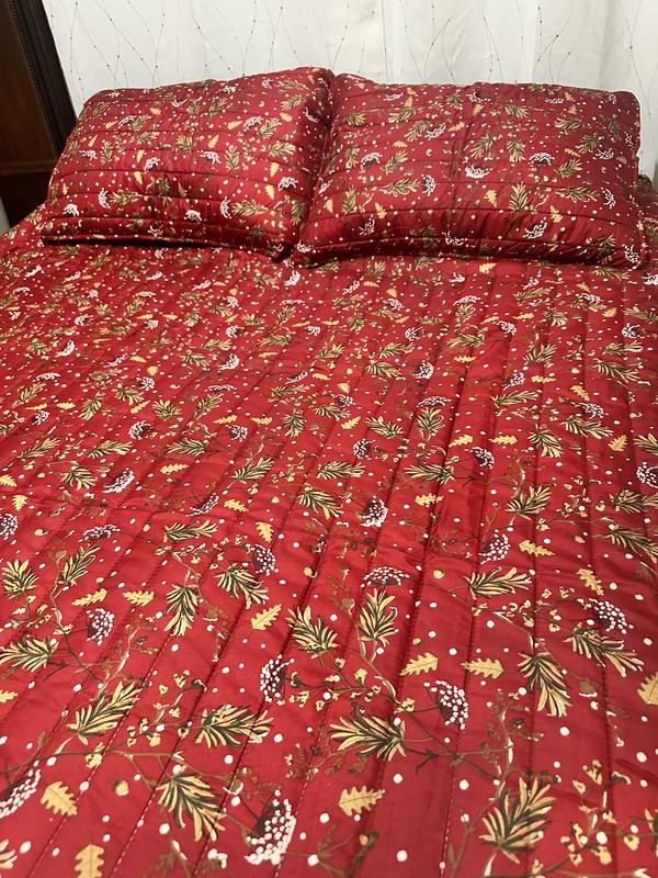 This quilt set is beautiful! The red provides a stunning backdrop for the holidays, winter, or a cabin setting. I like the pattern of pine sprigs with flecks of white giving it the appearance of snow. The stitching on the quilt appears of good quality with no loose threads. It is lightweight meaning it'll be easy to launder, yet has a good thickness to provide ample warmth. It is a good size and covers my queen bed well without appearing small. Most importantly, it will look perfect in my guest room for the holidays and winter.