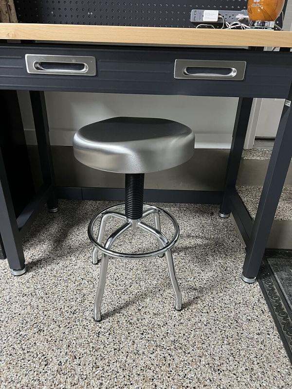 This chair is a good addition to the bench purchased previously. Much more comfortable than having a meatal seat would seem. Not having wheels was a better idea than when I first looked at it, as I could see myself careening across the garage floor if not paying attention. Height adjustable and molded seat make it easy to work on little things on the bench.